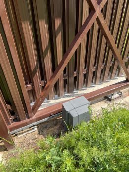 По всему периметру участка установлен забор из металлопрофиля. Въездная зона оборудована ЭЛЕКТРИЧЕСКИМИ ОТКАТНЫМИ воротами. На участок