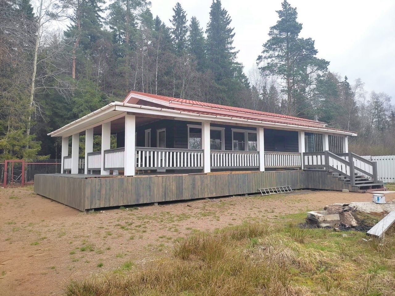 Все "ПОД КЛЮЧ" - электричество 15 КВТ, центральное зимнее водоснабжение, канализация - "Коловеси", отопление - двухконтурный котел 9квт, водяные("незамерзайка") радиаторы, бойлер 200 литров. Теплая площадь дома - 80 кв.м., две спальни и кухня гостинная, плюс терраса вокруг дома по двум сторонам - 60 кв.м. Силовой каркас дома - заводской домокомплект из древесины камерной сушки ПЕТРОЗАВОДСКОГО ДОМОСТРОИТЕЛЬНОГО ЗАВОДА. Фундамент - ж/б сваи. Цоколь ЦСП !!!. Крыльцо на металлическом каркасе!!!, Дорогая шумоизоляция крыши. Огорожен забором !!!