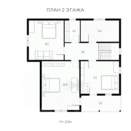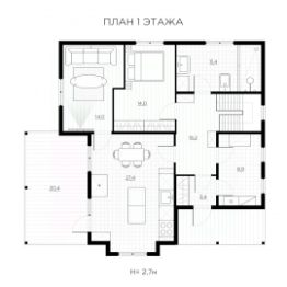 Планировка: 1 этаж — кухня-гостиная 27.4 м², спальня, комната отдыха, с/у. 2 этаж — 3 спальни (28 м², 17 м², 19 м²), кабинет, помещение под с/у или гардеробную.