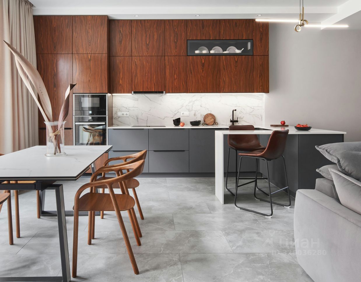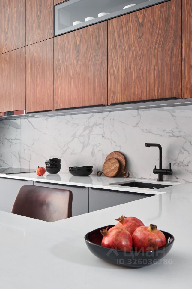 Кухня- рабочая зона укомплектована премиальной техникой NEFF и LIEBHERR, фасады отделаны натуральным шпоном палисандра, мойка и кран японского бренда Omoikiri.