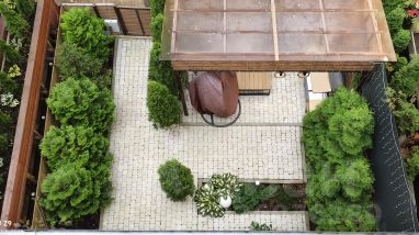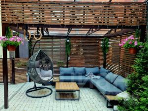 На участке установлена пергола с прозрачной крышей из оргстекла. Освещение на участке для вечернего времяпровождения на воздухе, в окружении зеленых насаждений.