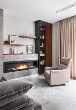 В зоне гостиной стена из натурального каменного шпона, встроенный биокамин Kronco. Люстра и светильники производства Италии и Испании.