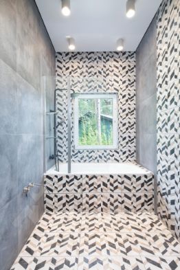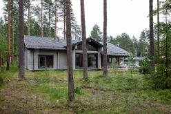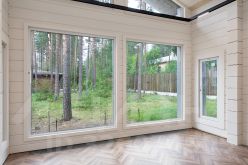Проект дома в один этаж из клееного бруса с панорамным остеклением и протяженной террасой.