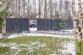 Установлен забор из металлического евроштакетника, гармонирующий с цветом дома.