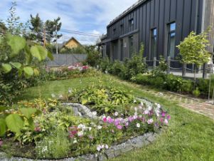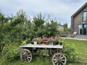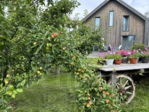 Много плодовых деревьев, кустарников, многолетние цветы.