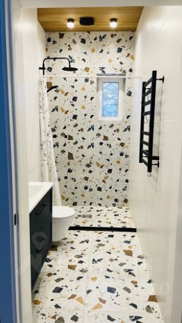 Полы уложены плиткой керамогранит Kerama Marazzi с затиркой эпоксидки.