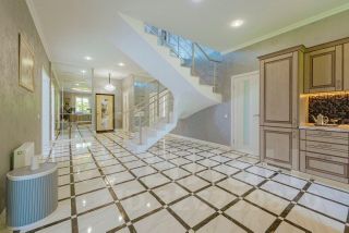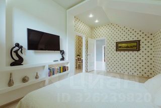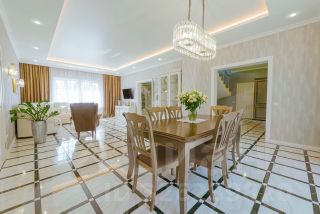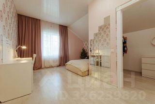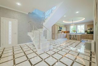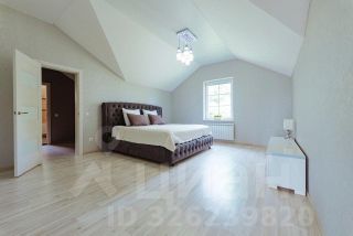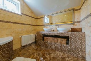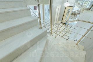 • На втором этаже — четыре спальни (в двух из них есть совмещённый санузел с душевой и гардеробной), большой холл и балкон. Лестница выполнена из мрамора.