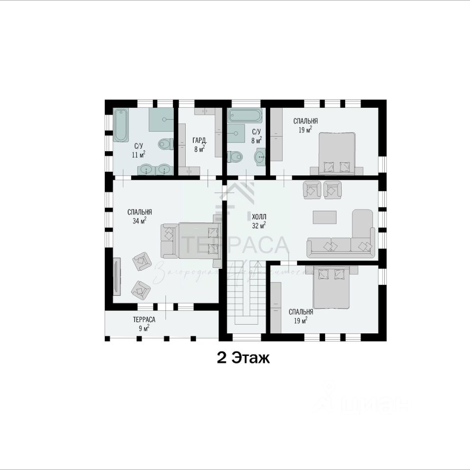 2 этаж - 3 изолированные комнаты (одна из них - с выходом на террасу, отдельной гардеробной и с/у), просторный холл с ТВ-зоной, с/у.