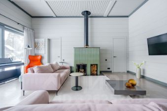 В доме есть мастер-спальня с собственным санузлом, гостевая спальня, кабинет и просторная светлая кухня-гостиная, главным украшением которой является камин с открытым огнем. Гостевой санузел с финской сауной, небольшой, но очень уютной. Просторная котельная, она же постирочная со шкафами для хранения.