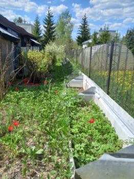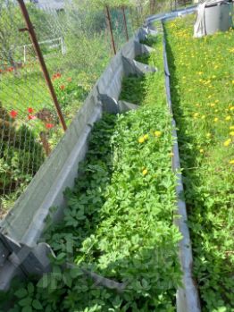 Участок квадратной формы, огорожен с трех сторон надежными вечными грядами из оцинкованного толстостенного железа. Из него же ограждение водоема и основание теплицы. Накопительный бак для воды.