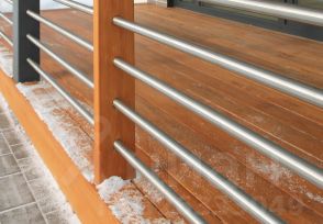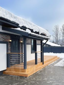 — Терраса и крыльцо: технологичная стеклянная крыша, палубная доска из лиственницы, покрытая лазурью Remmers, ориг. ограждения из нерж. стали
