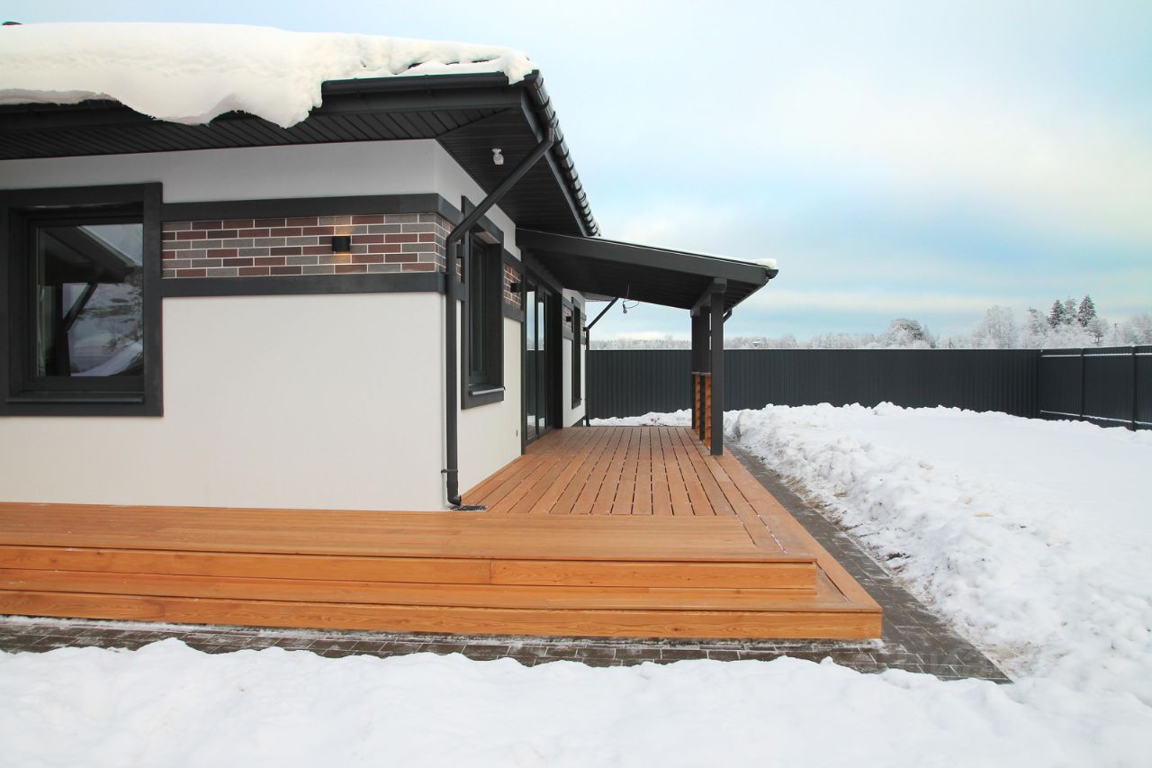 — Самоочищ. краска STO Lotusan, декор. штукатурка Baumit, планкен из лиственницы, декор. покрытие из мраморной крошки