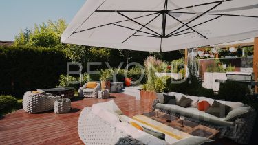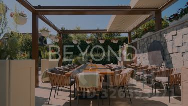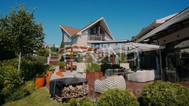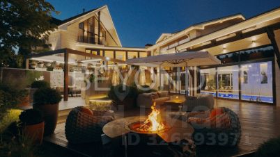 Летняя кухня, зона BBQ и уличная обеденная зона под технологичной двухзонной перголой. Системы "умный дом", климат-контроль, видеонаблюдение.