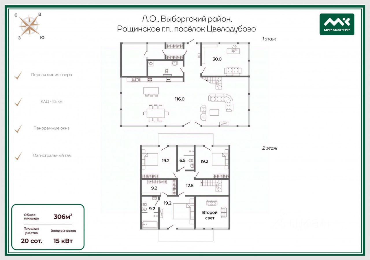 прихожую, гардеробную, кухню-гостиную со вторым светом (высота потолка 7 м!) - общей площадью почти 100 кв. м! Дом, в котором легко дышится - высокие потолки, дерево, мягкий свет в просторной гостиной! Из окон первого этажа открываются великолепные виды на озеро! Кроме того, здесь расположены: гостевая комната (или кабинет) 30 кв м, санузел, котельная, кладовая, постирочная.