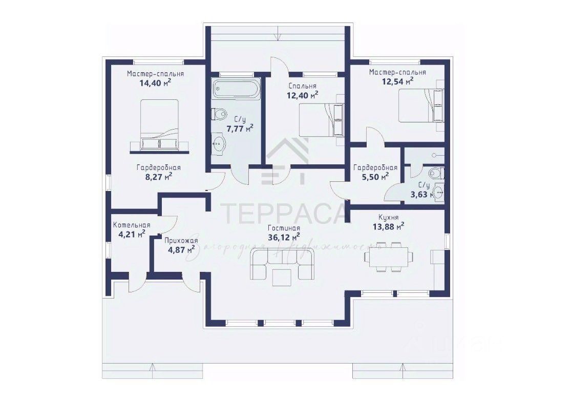 1 этаж - кухня-гостиная, 3 изолированные комнаты (две - мастер-спальни с гардеробными), прихожая, котельная, 2 с/у.