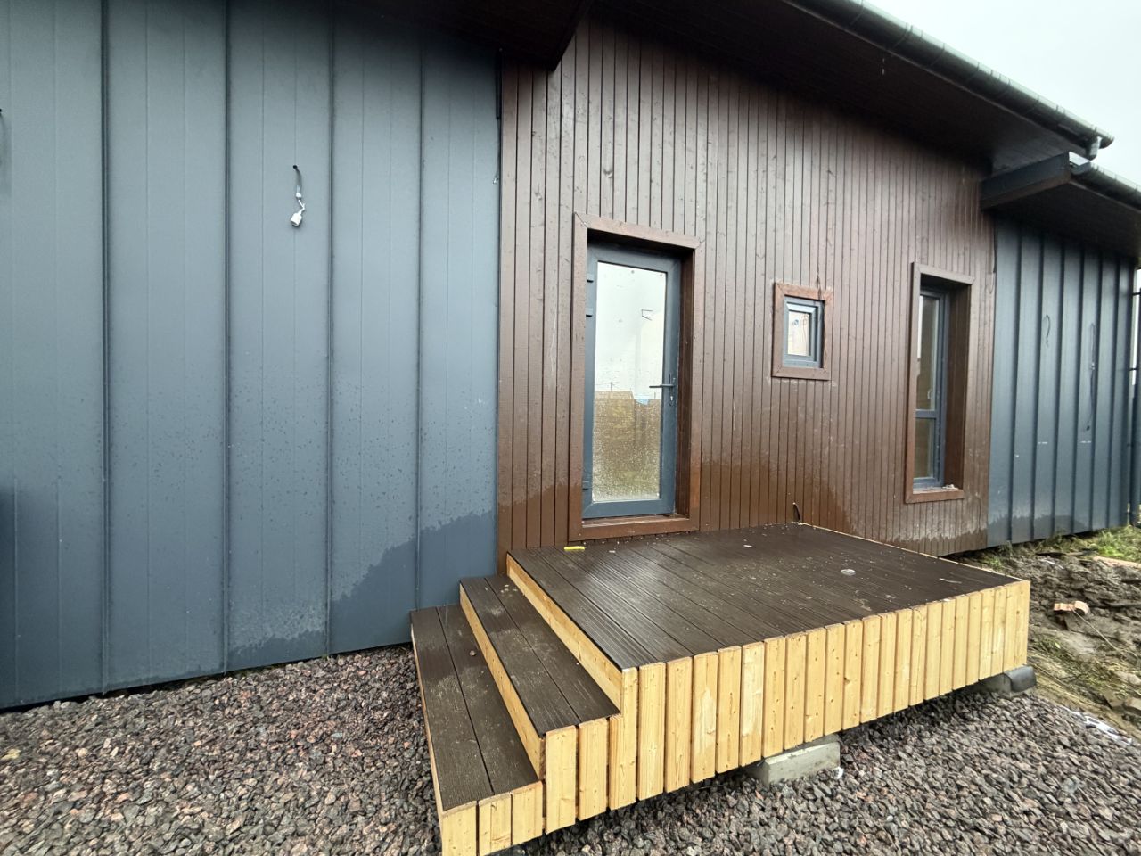А так же большая терраса (выполненная из террасной доски).Выполнен вывод всех труб под кухню.Осталось поставить кровать и въезжать )