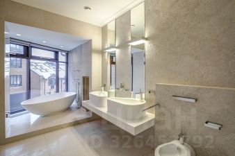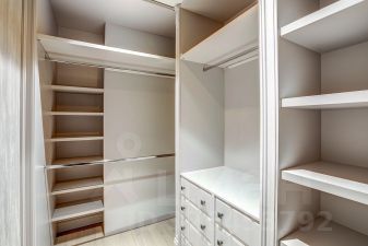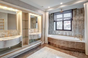 На втором этаже расположена большая мастер спальня с двумя гардеробными (одна из которых с панорамными окнами) и ванной комнатой, где установлена качественная и дорогостоящая сантехника зарубежных брендов и использовался мрамор в отделке. Также имеется гостевая комната с окнами в пол и встроенным шкафом, санузел с душевой кабиной уникального дизайна.