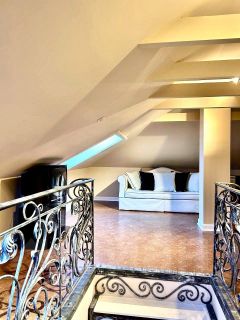 -Уютный мансардный этаж: Идеальное пространство для детей или как дополнительная зона для отдыха с мягкими диванами и мансардными окнами.