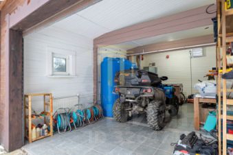 Большой гараж на две машины в едином стиле, на монолитном фундаменте. Общая площадь 24 м2 закрывается рулонными воротами + 21м2 открытое пространство под навесом. В гараже оборудование: