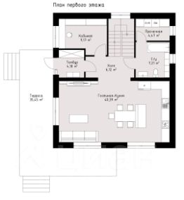 • 1 этаж: кухня-столовая с гостиной и выходом на террасу, спальня, санузел, прихожая.