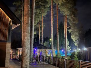 Ландшафтный дизайн с освещением. Мощение из брусчатки, газон, туи, ели, вековые сосны