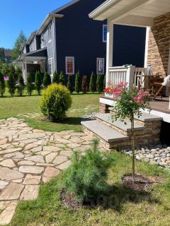 На участке посажены декоративные растения и цветы,с любовью обустроен.