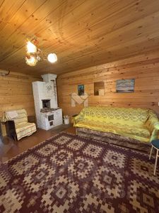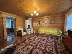 Дом бревенчатый крепкий, утеплен с двух сторон, стоит на ленточном фундаменте, внутри отделан вагонкой, в доме есть печь. На первом этаже расположены большая светлая комната, помещение для кухни, и каркасная крытая веранда.
