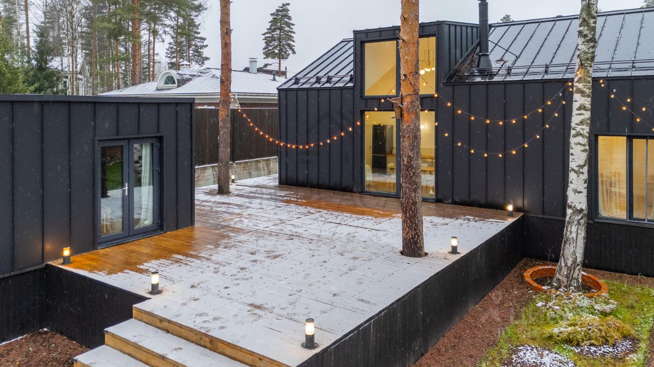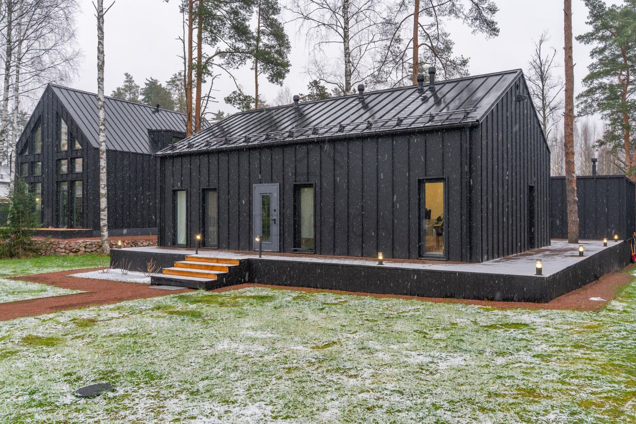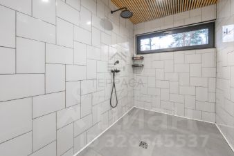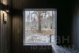 От дома по террасе попадаем в стильную баню с панорамным окном.