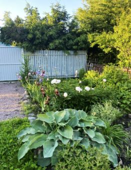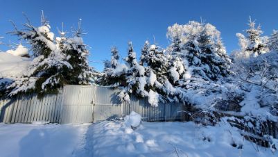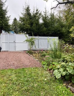 Забор по всему периметру: спереди — металлопрофиль с распашными воротами, по бокам и сзади — прочный деревянный. Участок надёжно огорожен, уютен и защищён.