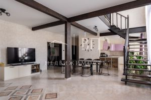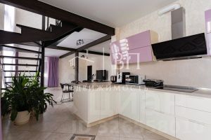 Светлая кухня-гостиная (61,3 кв.м) с большим панорамным окном, полностью оборудована современной мебелью и техникой (посудомоечная машина, духовой шкаф, большой холодильник), которая остается новым собственникам. Также имеется отдельная комната (12 кв.м).