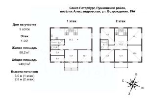 Общая площадь 240 кв.м, двухэтажный, высота потолков на 1 этаже - 3 м., на 2 этаже - 2,8м.
