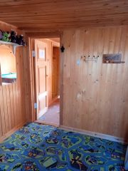 Стены в комнатах выполнены из вагонки, на веранде и с/у из имитации бревна, на террасе из имитации бруса.