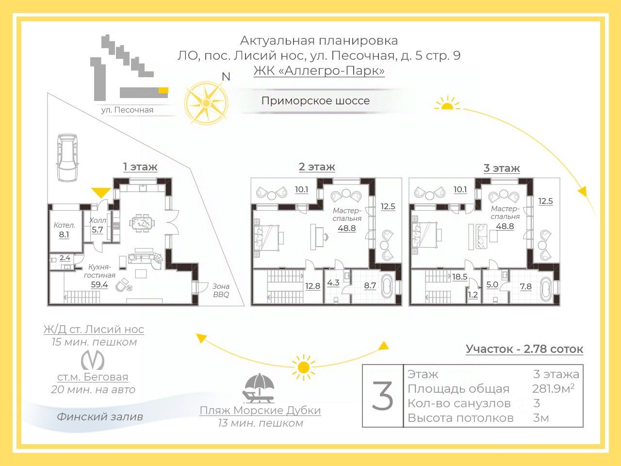 до Приморского шоссе, КАД и ЗСД — около 3 км;
