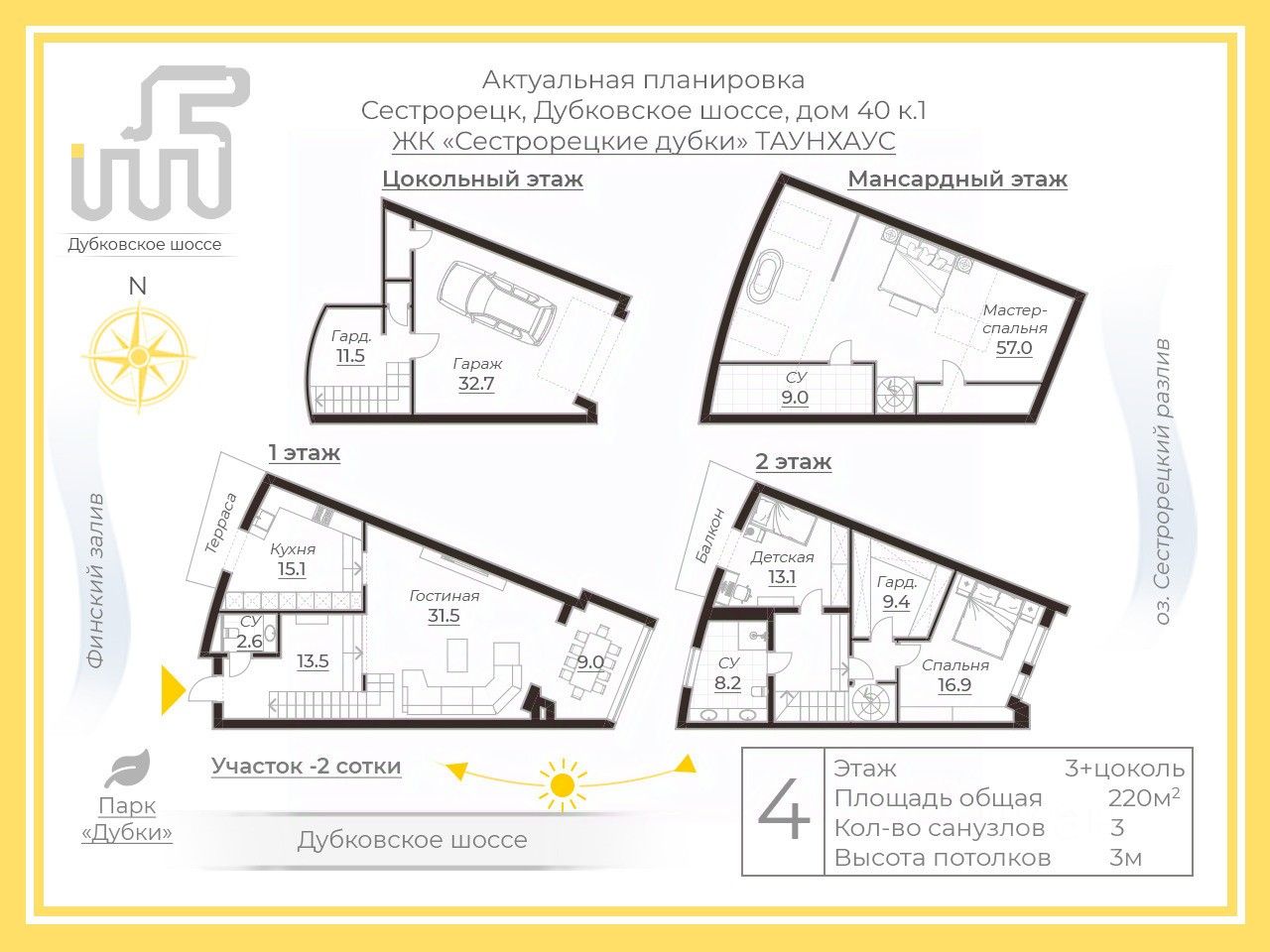 Жилой комплекс расположен в Курортном районе, в прибрежной зоне Финского залива, на границе с парком "Дубки", находящимся под охраной "ЮНЕСКО". В парке богатая спортивная инфраструктура: старинная конюшня, каток, множество детских секций, академия большого тенниса, футбольная академия клуба "Зенит", лодочная станция.
