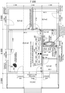 Фундамент: сваи. Площадь застройки: 11*7,1. По внутреннему контуру ~58 м.кв. По росреестру 69 м.кв.