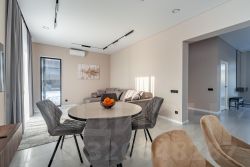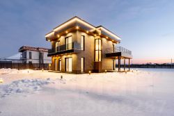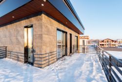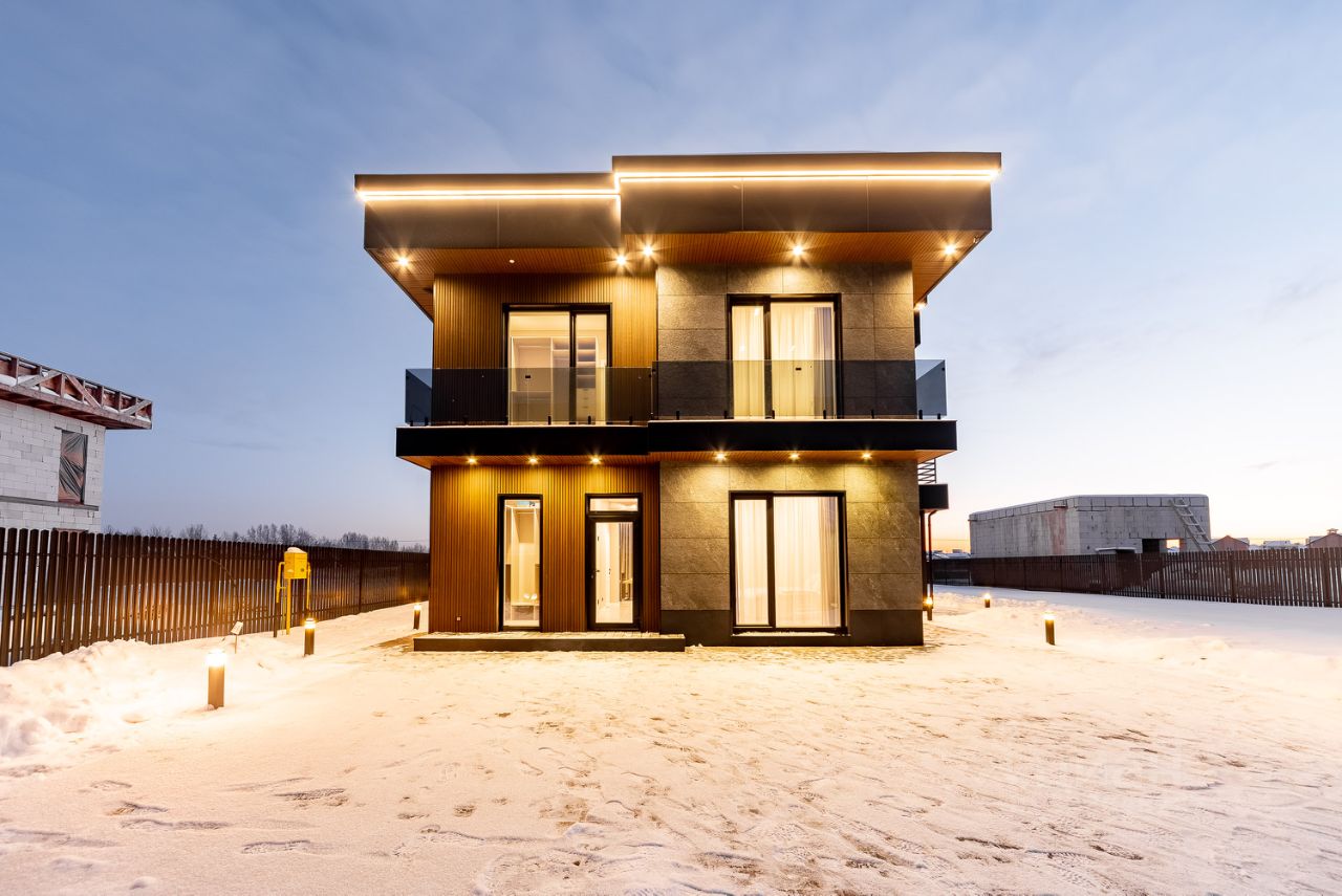 Дом построен из газобетона, фундамент железобетонная плита, вентилируемый фасад выполнен из керамики и композитных материалов.