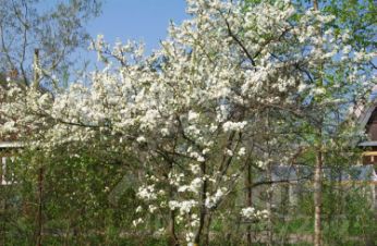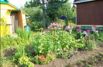 Ухоженная территория: плодовые деревья, ягодные кусты, цветник.