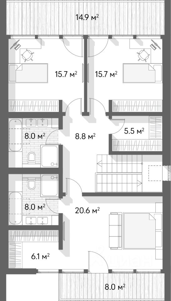 Второй этаж наполнен светом благодаря карнизному окну над лестницей. Здесь находится мастер-спальня с собственным санузлом, гардеробной и приватным балконом, а также две просторные детские комнаты с выходом на общий балкон. Дополняют планировку общий санузел и кладовая-гардеробная.