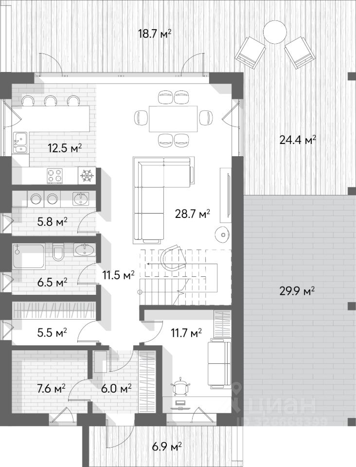 Просторная гостиная объединена с кухней-столовой: здесь легко разместятся островная кухня, барная стойка и большой семейный стол.