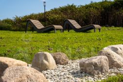 Благодаря панорамному остеклению гостиная практически сливается с широкой террасой, которая становится естественным продолжением общего пространства.