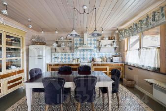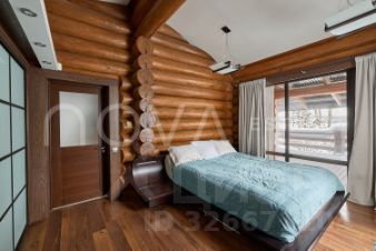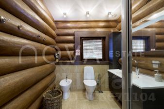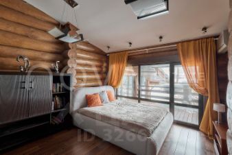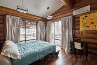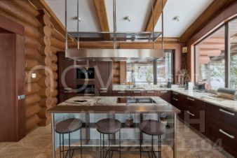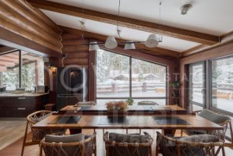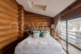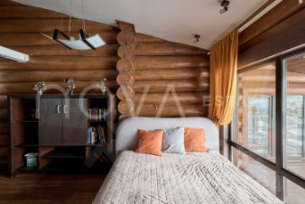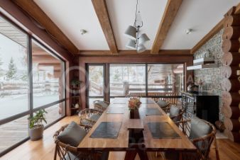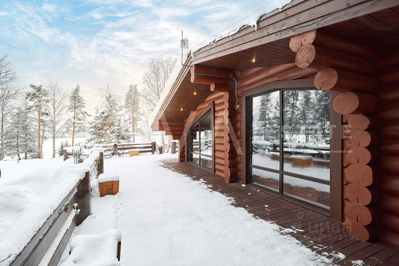 Основной дом, общей площадью 415 квадратных метров, представляет собой одноэтажное строение из сосны с продуманной двухуровневой планировкой. В центральной зоне расположены кухня, столовая и гостиная с панорамными окнами, из которых открывается захватывающий вид на озеро. Три спальни, включая мастер-спальню, и два санузла обеспечивают необходимый уровень уединения и укрытия. Гостевой дом, площадью 180 квадратных метров, построен из бруса и предлагает три спальни с аналогичными видами на водную глади.