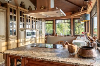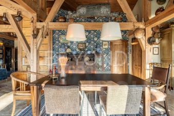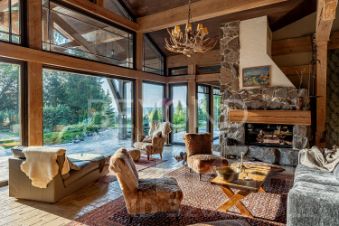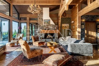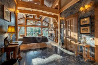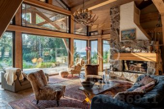 Объемная гостиная в духе швейцарского поместья с потрясающим пейзажем за окном, придающим дому меняющийся характер. Днем - это бодрость лучей света и умиротворение от пения птиц, а вечером - это спокойствие у камина.