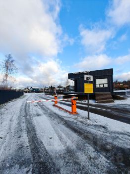 Въезд в поселок через шлагбаум. Прямо у поселка магазин Пятерочка.