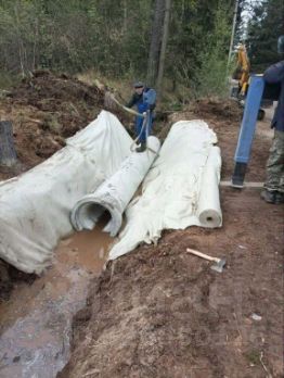 В дренажную канаву со стороны дороги уложены водоотводные железобетонные трубы 10 метров;