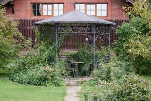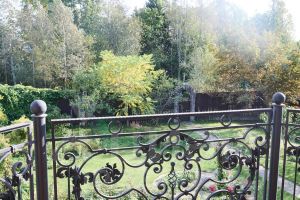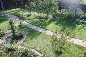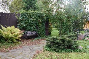 На земельном участке выполнен ландшафтный дизайн с декоративными элементами, вымощены дорожки и высажены плодовые деревья.