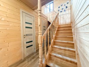 Это двухэтажный дом общей площадью 223 кв.м. с выходом из кухни-гостиной на террасу. На первом этаже расположены 2 жилые комнаты, спальня с панарамным остеклением и собственной гардеробной, санузел и котельная. На втором этаже находятся 2 спальни и мансарда. Дом построен на ровном и большои участке 13 соток в непосредственной близости к лесу!