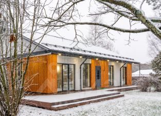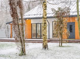 Главная особенность дома - ощущение свободы и света, этому способствуют высокие потолки и панорамные окна, стирающие границы между интерьером и природой.