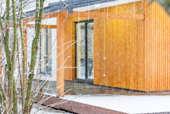Отделка фасада штукатуркой и декоративным планкеном.