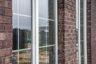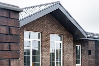 Стены выполнены из газобетона и облицованы полнотелым кирпичом с вентиляционным зазором. Кровля выполнена из металло-черепицы.