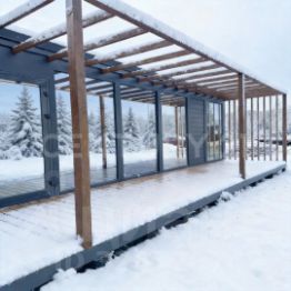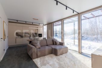 Организованы три входа в дом, просторная терраса, большая кухня-гостиная, санузел, мастер спальня + спальня (детская или гостевая). Дом очень светлый и легкий благодаря панорамному остеклению.